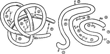 Схематическое изображение высвобождения химически активных групп при обратимой денатурации белковой молекулы и разрыве водородных, ионных и дисульфидных связей. 1-5 — внутримолекулярные связи и активные группы, страдающие при их разрушении