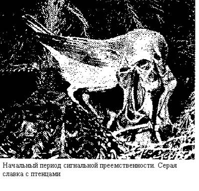 Многие черты в поведении птиц, которые входят в «видовой стереотип их поведения» и считались ранее генетически закрепленными, после соответствующих исследований оказываются приобретенными или формирующимися в онтогенезе на базе опосредованного обучения и прежде всего «сигнальной преемственности». Это было установлено у ряда видов птиц для особенностей песни и некоторых акустических сигналов, имеющих в природе определенный видовой стереотип.