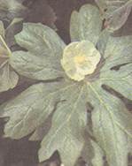 Описание растения. Подофилл щитовидный—многолетнее травянистое растение семейства барбарисовых, достигающее в высоту до 50 см. Корневище горизонтальное, узловатое, простое или разветвленное, снаружи красновато-коричневое, на изломе белое, длиной до 1 м и 1,5 см ^в поперечнике. Придаточные корни, отходящие от узлов корневища, многочисленны, мясистые, снаружи светло-бурые, на изломе белые, длиной до 35 см и 0,5 см в поперечнике. Стебли прямые или слегка изогнутые, неветвистые, округлые, полые, розоватые, высотой до 45 см и 1,1 см в поперечнике, у основания с 1—3 пленчатыми влагалищными листьями. Листья очередные, округлые, пальчаторассеченные на 7—9 двулопастных сегментов, диаметром до 40 см. Цветок поникающий, одиночный, белый, диаметром до 7 см, с ароматным дынным запахом. Плод—съедобная, многосемянная округлая или яйцевидная, мясистая, кисловато-сладкая, ароматная, лимонно-желтая ягода длиной до 8 см.
