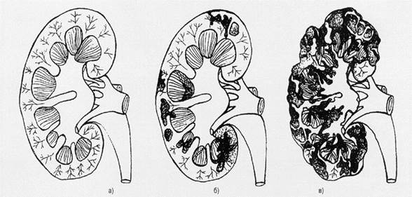 Рис.1. Строение почки кошки а)нормальная почка; б)почка кошки, страдающей ПКП с начальными изменениями в паренхиме в виде мелких полостей; в) почка кошки, в конечной стадии ПКП, паренхима полностью замещена множественными крупными кистами
