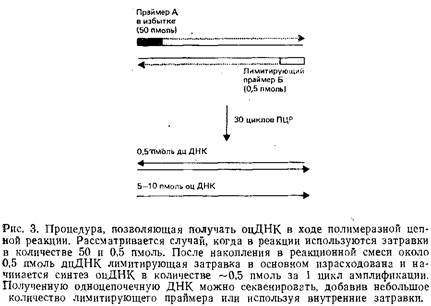 Эта процедура предусматривает использование неэквивалентных количеств двух праймеров для амплификации, что позволяет синтезировать за первые 20-25 циклов двухцепочечную ДНК и за последующие 5-10 циклов в условиях недостатка одного из праймеров — одноцепочечную ДНК.