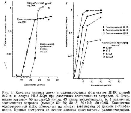 Рис. 4, А демонстрирует накопление дцДНК и оцДНК в ходе обычной амплификации геномной последовательности, использующей исходное соотношение затравок 50:0,5 пмоль в 100 мкл реакционной смеси. Как и ожидалось, количество дцДНК возрастает экспоненциально до момента практического исчезновения из реакционной смеси одного из праймеров, после чего количество этой ДНК нарастает очень медленно. Фракция оцДНК появляется, начиная с 25-го цикла, с момента, когда запас лимитирующей затравки почти полностью исчерпан. После короткой начальной стадии быстрого роста оцДНК накапливается линейно, чего следует ожидать в присутствии одного праймера.