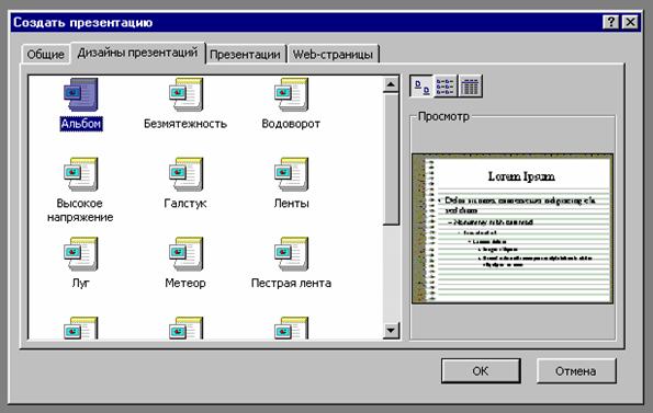 В этом диалоговом окне можно задать шаблон дизайна презентации. После щелчка на одном из шаблонов в окне Просмотр можно увидеть его изображение. Выбрав шаблон, выполним на нем двойной щелчок. В результате откроется диалоговое окно Создать слайд.