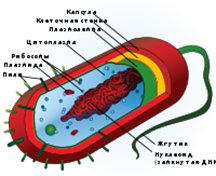 Строение типичной клетки прокариот: капсула, клеточная стенка, плазмалемма, цитоплазма, рибосомы, плазмида, пили, жгутик, нуклеоид.
