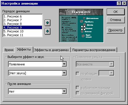 Все объекты слайда отображаются в поле предварительного просмотра в правой верхней части окна. Кнопка Просмотр позволяет увидеть в этом поле, как будет выглядеть презентация с заданными в окне параметрами. Чтобы отменить анимационный эффект для выбранного объекта, перейдите на вкладку Время и установите опцию выключить.