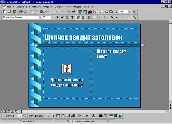 В полях всех слайдов, кроме пустого, находятся местозаполнители (placeholders), указывающие, куда вводить информацию: заголовок, список, диаграмму, таблицу, графический объект или клип. Места вставки обозначены на слайде тонкой пунктирной линией и содержат стандартные приглашения вводить объекты.