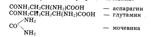 Роль амида, аспарагина, глютамина и мочевины в растении. При восстановлении нитратов, а также при дезаминировании аминокислот (т.е. отщеплении от них аммиака) в растениях может накопляться аммиак, который ядовит для большинства из них. В растении аммиак обезвреживается, так как он связывается аспарагиновой или глутаминовой кислотой, образуя соответственные амиды (аспарагин, глутамин). У многих низших растений образуется мочения: