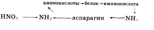 Подводя итоги, можно отметить два типа синтеза белков: первичный и вторичный. В обоих этих синтезах аммиак играет большую роль, что и дало возможность Д.Н. Прянишникову сказать, что аммиак есть альфа и омега (первая и последняя буквы греческого алфавита), т.е. начало и конец, превращения белков в растениях. При первичном синтезе из аммиака и углеводов строится белок (левая часть схемы). При распаде белка образуются аминокислоты, от которых при дезаминировании отщепляется аммиак, связывающийся в аспарагин или глютамин. При вторичном синтезе белков (правая и нижняя части схемы) происходит отщепление аммиака от аспарагина и образование аминокислот из углеводов (вернее, из продуктов их превращения) и аммиака. Все эти представления можно объединить в следующую схему Прянишникова:
