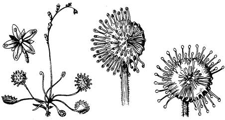 Росянка - многолетнее растение, растет на сфагновых болотах. Каждый год на поверхности мха образуется новая розетка листьев росянки. Листья снабжены многочисленными железистыми волосками (их часто называют щупальцами), выделяющими липкую жидкость, к которой и прилипают мелкие насекомые - комары и мелкие мухи. При прилипании насекомого пластинка листа свертывается. Особенно хорошо это свертывание пластинки видно у вида росянки длиннолистной. После того как насекомое прилипнет к листу, в растении начинается выделение гидролитических ферментов - протеаз, разлагающих белки, и муравьиной кислоты. Кислота способствует работе фермента протеазы, и, кроме того, она действует как яд на бактериальную флору. Последнее очень важно, так как пышное развитие флоры гнилостных бактерий могло бы сказаться отрицательно на самом растении.