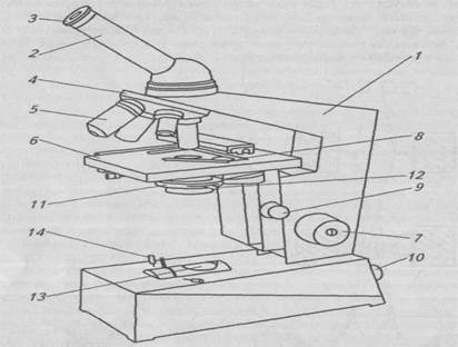 Механическая часть включает штатив, предметный столик, тубус и систему винтов для передвижения элементов микроскопа. Штатив состоит из основания и неподвижно привинченного тубусодержателя. В верхней части штатива расположены тубус 2, куда вставляется окуляр 3, и револьверное устройство 4, состоящее из двух пластин. Нижняя пластина вращается и имеет гнезда для объективов 5, верхняя закреплена неподвижно.