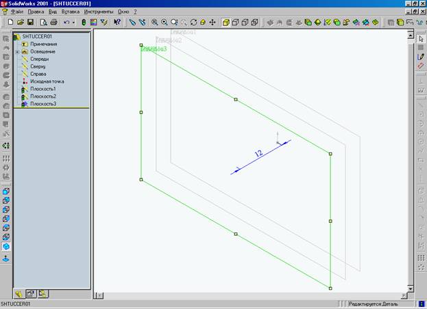 Нажав правую кнопку мыши на пустой области окна – открывается меню в котором мы выбираем пункт «ЗАКРЫТЬ ЭСКИЗ», двойным нажатием на пункте в дереве конструирования – «ПЛОСКОСТЬ 2» - мы переходим в нее. Используя функцию вставки из буфера обмена мы вставляем в плоскость 2 скопированный эскиз и получаем «ЭСКИЗ 3».