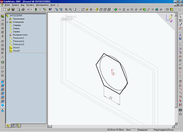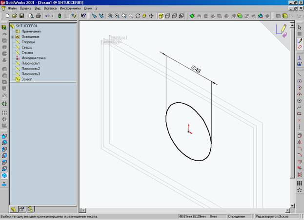 Выбрав нулевую точку в дереве конструирования двойным щелчком, включаем режим «ЭСКИЗ 1» - в правом меню включаем кнопку «ОКРУЖНОСТЬ» и видоизмененным курсором идем к нулевой точке, в момент пересечения с центральной точкой курсор сигнализирует оранжевым значком, далее левой кнопкой мыши устанавливаем центр и двигая мышью в сторону начинаем растягивать окружность до нужного нам радиуса – 24 мм. Повторным нажатием левой кнопки мыши при достижении нужного значения – формируется окружность «ЭСКИЗА 1». Необходимым условием моделирования в пакете Solid Works 2001, является определение эскиза (или описание его размером и связями). Для этого в правой части окна выбираем пиктограмму «РАЗМЕР» и коснувшись контура полученной окружности в противоположных точках – курсор принимает вид размерной линии и дает возможность разместить текущий размер в удобном для нас виде и в удобном для нас месте. После того как эскиз становится определенным - его контур с синего цвета преобразуется в контур черного цвета. В самом низу окна – есть так называемая полоска состояния – в ней так же можно увидеть, что наша фигура определена.