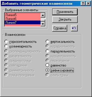 После того как первый эскиз – представляющий окружность, создан, вызвав правой кнопкой мыши всплывающее окно свойств, выбираем пункт «ЗАКРЫТЬ ЭСКИЗ», и переходим на следующую плоскость – плоскость 1, щелкая по контуру мышкой. Аналогично выше написанному, снова включаем режим эскиза. В дереве конструирования открывается новый пункт «ЭСКИЗ 2». Эскиз 2 представляет собой правильный шестиугольник со стороной равной радиусу описываемой его окружности – 28 мм. Для построения эскиза воспользуемся инструментом «ЛИНИЯ», предварительно нужно для легкости построения в текущей плоскости построить сначала окружность (аналогично предыдущему построению но без определения размером) и провести горизонтальную линию симметрии. Далее на основе контура окружности откладываем три отрезка равной длинны 28 мм. В результате получаем трапецию (Рис 3.5). Путем выделения этих отрезков курсором с удерживаемой клавишей «Ctrl» с осевой линии – выделяем эту группу, затем в правой части меню кликнув на пиктограмке «ЗЕРКАЛЬНОЕ ОТОБРАЖЕНИЕ», получаем копию трапеции ниже осевой линии. Удалив предварительно построенную окружность и осевую линию – получаем лишь один эскиз правильного шестиугольника. Дальнейшей нашей задачей является его определение. Для этого мы выбрав пункт «РАЗМЕР» - определяем сторону шестигранника, так же необходимо установить для нашего эскиза в плоскости-1 – взаимосвязь, для этого нажмем кнопку «ДОБАВИТЬ ВЗАИМОСВЯЗЬ» в правой части окна. Открывшееся окно «ДОБАВИТЬ ГЕОМЕТРИЧЕСКИЕ ВЗАИМОСВЯЗИ» (Рис 3.6), позволяет сделать привязку объекта эскиза к определенному порядку построения схемы изображения. В нашем случае нужно просто поставить галочку в пункте «ЗАФИКСИРОВАТЬ» - и наш эскиз становится определенным и его контур принимает черный цвет.