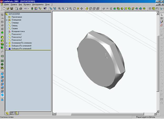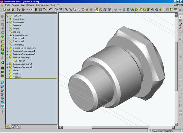 Для этого в левой части рабочего окна включаем кнопку «ЭЛЕМЕНТ ПО СЕЧЕНИЯМ», затем курсором с одновременно удерживаемой клавишей «Ctrl» мы поочередно выделяем первый и второй контур –- получаем первую фаску, при этом в дереве конструирования отображается новый пункт «ОСНОВАНИЕ- ПО СЕЧЕНИЯМ», продолжая построение снова включаем кнопку «ЭЛЕМЕНТ ПО СЕЧЕНИЯМ» и выделяем область от шестигранника до шестигранника – НАЖИМАЕМ «OK» - получаем вытянутую бобышку (в нашем случае объемное представление шестигранника), и аналогично самому первому построению – получаем вторую фаску. В дереве конструирования добавляется еще два пункта –«БОБЫШКА - ПО СЕЧЕНИЯМ4» и «БОБЫШКА - ПО СЕЧЕНИЯМ5».
