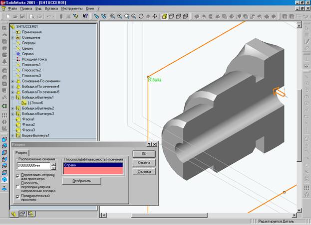 Включив режим «РАЗРЕЗ» в верхней части панелей инструментов, мы наглядно представляем внутреннюю конфигурацию детали (Рис 3.11).