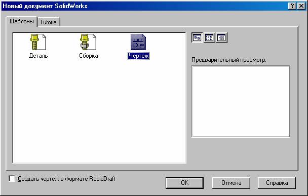 Для того чтобы непосредственно от модели перейти к чертежу, необходимо снова обратится в меню «ФАЙЛ», «СОЗДАТЬ НОВЫЙ ДОКУМЕНТ», в открывшемся окне выделяем пиктограмку «ЧЕРТЕЖ», затем «ОК», далее еще в одном открывшемся окне выбираем формат чертежа и получаем рабочее окно с видом формата.