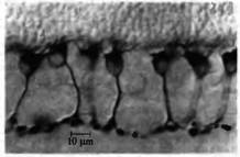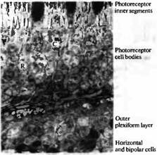 Рис. 1.3. Плотная упаковка нейронов в сетчатке обезьяны. Помечена одна палочка (R) и одна колбочка (С).