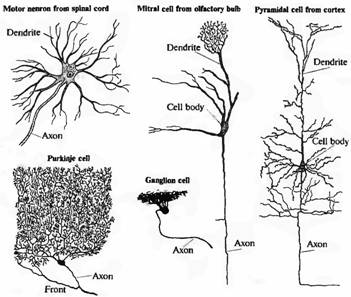 Ганглиозная клетка, показанная на рис. 1.4, иллюстрирует особенности строения нервных клеток, присущие всем нейронам центральной и периферической нервной системы. Клеточное тело содержит ядро и другие внутриклеточные органеллы, общие для всех клеток. Длинный отросток, который покидает тело клетки и образует связь с клеткой--мишенью, называется аксоном. Термины дендрит, тело клетки и аксон применяются к отросткам, на которых входящие волокна образуют контакты, играющие роль принимающих станций для возбуждения или торможения. Кроме ганглиозной клетки, на рис. 1.4 показаны другие виды нейронов. Термины для описания структуры нейрона, в частности дендритов, несколько спорны, но, тем не менее, они удобны и широко применяются.