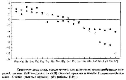 На рис. приведены два профиля для цитохрома Р450 из микросом. Этот белок был выбран потому, что данные о его первичной структуре позволяют высказать предположение о наличии у него восьми трансмембранных спиралей. Однако имеющиеся экспериментальные данные указывают на существование только одного N-koh-цевого якоря в мембране. Как профиль Кайта–Дулиттла, так и профиль Голдмана–Энгелмана–Стейца выявляют N-конце-вой участок, но они указывают и на наличие одного или более дополнительных трансмембранных сегментов, что не соответствует действительности. Отметим, что многие из построенных моделей мембранных белков, которые основываются лишь на данных об аминокислотной последовательности, могут быть некорректными.