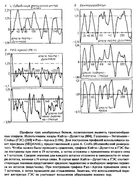Попытаемся проинтерпретировать построенные профили. По шкале Голдмана–Энгелмана–Стейца пики при значениях, близких к нулю, соответствуют трансмембранным спиралям. Значение 1,25 по шкале Кайта–Дулиттла является наименьшим значением, отвечающим известной трансмембранной спирали в L-субъе-динице реакционного центра R. viridis. Во всех трех случаях, представленных на рис. 3.12, профили для субъединиц реакционного центра сходны.