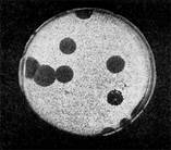 Иллюстрация 16: Негативные колонии актинофага, окруженные ореолом угнетенного роста тест-культуры. Увел. 10:8.