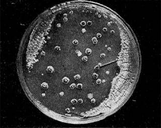 При выращивании микроорганизмов в жидкой среде совместно с активным против них фагом обычно наблюдается следующее. Сначала среда мутнеет, а затем просветляется в результате лизиса клеток. В ряде случаев через некоторое время (разное для разных микробов и фагов) культуральная жидкость снова мутнеет. Помутнение среды происходит вследствие возобновления роста культуры. На агаризованных средах при нанесении фага на газон чувствительной к нему культуры можно наблюдать вначале лизис культуры в местах нанесения фага, а через некоторое время на лизированных участках появляется рост культуры, обычно в виде отдельных колоний (рис. 218).