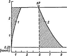 Соотношение кислородного дефицита и кислородного долга при интенсивной мышечной деятельности человека. По оси абсцисс — длительность работы, с; по оси ординат — потребление Ог, л/мин, KP — конец работы