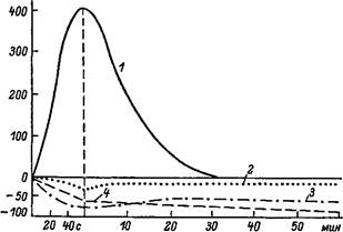 Расходование энергетических потенциалов мышцы в пусковой фазе и при работе в условиях устойчивого состояния. По оси абсцисс — время; по оси ординат — изменения от уровня покоя, Д%. 1 — молочная кислота, 2 — АТФ, 3 — КФ, 4 — гликоген
