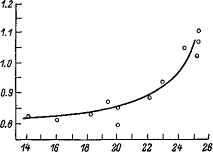 Соотношение между возможностями гликолиза в мышцах и их буферностью. По оси абсцисс — интенсивность гликолиза, мкмоль молочной кислоты на 1 г ткани в 1 мин; по оси ординат — мл 0.1 моль HCl, смещающие рН до 2.5