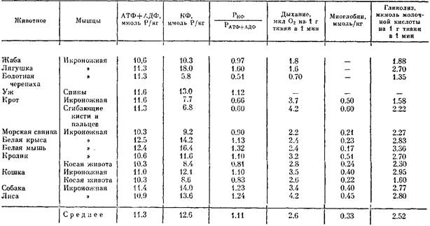В мышцах позвоночных животных концентрация АТФ тоже практически одинакова, тогда как содержание КФ и интенсивность гликолиза выше у более быстро движущихся животных: у лягушек выше, чем у жабы; у ужа выше, чем у черепахи; у быстрой мыши выше, чем у медлительной морской свинки, а у собаки и лисы, которые в быстроте бега могут соперничать друг с другом, эти показатели почти одинаковы. Широко варьируют и интенсивность дыхания мышечной ткани, и содержание миоглобина в мышцах. Первый параметр наиболее высок у лисы и собаки, второй — у кролика и лисы, способных к длительному бегу в большей степени, чем другие животные. Столь же велики интенсивность дыхания и содержание миоглобина в мышцах крота, способного к продолжительному напряженному рытью. К этому можно добавить, что у диких птиц содержание миоглобина выше, чем у домашних; у зайца выше, чем у кролика; у дикого козла выше, чем у домашнего; у охотничьих собак выше, чем у домашних.