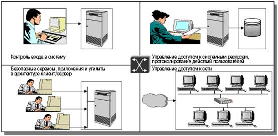 - Управление сетевым доступом защищает от вторжений из внешней среды, например, через Интернет. Этот тип защиты реализуют дополнительные продукты, такие как FireWall-1 и SunScreen SPF-100.