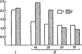 Влияние приспособления организма к повышенной мышечной деятельности на функциональное состояние митохондрий мышечных волокон (величина коэффициента Р/О — по оси ординат) в различных температурных условиях (по оси абсцисс), I — покой при оптимальной температуре; // — плавание 15 мин при разной температуре воды, 0C 1 — контрольные животные, 2 — тренированные