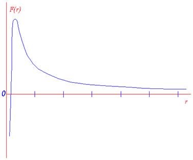Чтобы подтвердить это предположение соответствующим расчётом, необходимо было бы знать зависимость F(r) силы взаимодействия F между электроном и протоном в зависимости от расстояния r между ними, при расстояниях r меньше одного микрона. По принятой выше гипотезе эта зависимость должна выглядеть примерно так, как показано на рис. 2. Сила притяжения сперва растёт (примерно обратно пропорционально квадрату расстояния) по мере уменьшения расстояния, а затем быстро уменьшается до нуля и превращается в силу отталкивания, которая растёт ещё быстрей.