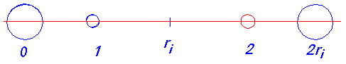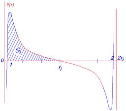 Нильс Бор считал, что характерный спектр излучения (водорода) происходит от движений электрона в поле одиночного протона. Поэтому происхождение бесконечной серии частот излучения водорода можно было объяснить только за счёт идеи “сложного устройства” атома. В среде частично ионизированного газа (водорода) гораздо более естественно ожидать движение электрона от одного протона к другому. Это позволяет отказаться от идеи сложного устройства атома (атом водорода состоит только из двух элементарных, т.е. простых частиц!) Сложный спектр может получаться за счёт относительно сложного (по сравнению с атомом) устройства сави. Нейтральный атом из одного из слоёв сави “теряет” свой электрон, его принимает ион (свободный протон) в центре сави. Так как слои нейтральных атомов находятся на различном, ступенчато изменяющемся расстоянии от иона в центре сави, то ступенчато меняется и необходимая для ионизации обмена (отрыва электрона от своего протона в поле другого протона) энергия. Этими расстояниями определяется порционирование энергии поглощения. Чисто схематически электрон всегда движется между двумя протонами (рис. 3), от положения равновесия вблизи одного протона к положению равновесия вблизи другого. То есть математически мы будем иметь дело с наложением двух поворотно симметричных функций, силовым воздействием двух протонов на один электрон. Силовое поле, в котором при этом движется электрон, схематически показано на рис. 4. Вблизи своего протона в точке 1 электрон получает импульс (порцию энергии). В идеальном случае его хватает как раз на то, чтобы достигнуть точку ri посредине между двумя протонами, где силовое воздействие равно нулю. В этой точке, израсходовав всю энергию, скорость электрона тоже становится (практически) равной нулю. Дальше электрон движется в симметрично равном силовом поле к другому протону и, достигнув положения равновесия (точка 2), имеет ту же самую энергию и тот же самый импульс, который имел по выходе из точки 1. Так как электрон в точке 2 имеет некоторый импульс, т.е. скорость, то он в точке 2 не сможет остановиться и проскочит её. Начиная с точки 2 на электрон будет действовать отталкивающая сила, поэтому он будет вскоре остановлен и отброшен обратно. После того, как он снова минует положение равновесия, он будет снова притягиваться в сторону точки 2 и т.д. При этом колебательном движении электрон будет излучать энергию. После определённого числа колебаний, излучив всю полученную энергию, электрон займёт положение равновесия в точке 2. Таким образом, расстоянием между двумя протонами, обменивающимися электроном, порционируется не только энергия поглощения, но и излучения.