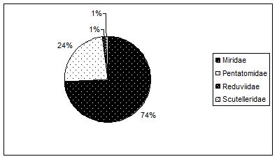 Значительно преобладает в отряде Hemiptera семейство Miridae с доминантным родом Polimerus sp. Семейство Pentatomidae составляет практически четверть от общего состава Hemiptera и представлено видами – Dolicoris baccarum, Peribalus vernalus, Carpocoris melanocerus. Семейство Reduviidae представлено одним видом – Rhynocoris iracundus и семейство Scutelleridae также отмечено наличием только одного вида – Eurygaster maura.