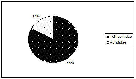 Отряд Orthoptera явился самым малочисленным из рассмотренных выше отрядов. Но в отличие от всех остальных видов экотона, самым «полноценным», т.е. представленным наличием двух ведущих семейств прямокрылых – семейства Tettigoniidae и семейства Acrididae, причем особи отмечены уже во взрослом состоянии (рис. 9).