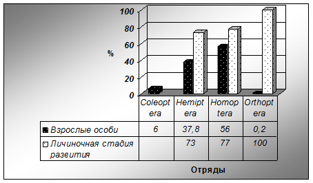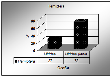 Отряд Hemiptera представлен только одним семейством Miridae и единственным здесь родом Polimerus sp. Для наглядного сравнения нами был выбран именно этот тип диаграммы потому, что можно отметить, что более 70% особей находится на стадии личиночного развития.