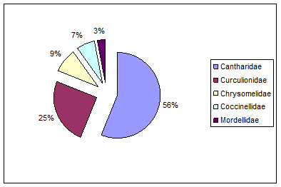 Доминантным семейством является семейство Cantharidae с видами Cantharis sudetica, Rhagonycha limbata и. Для семейства Curculionidae – Phyllobius argeutatus, Otiorhynchus tatarchani, Otiorhynchus bideutatus, Zacladus geranii. Менее распространенными явились семейство Chrysomelidae с видами и родом Gastroidea viridula, Cryptocephalus sp. И семейство Coccinellidae с одним отмеченным здесь видом Coccinula quatuordecimpunctata.