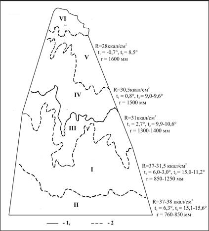 R – радиационный баланс, ккал/см2 ; t1 – средняя годовая температура; t2 – температура июля; r– годовая сумма осадков.