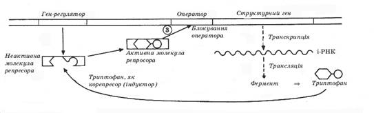 Схема 3. - Механизм репрессии фермента, который катализирует синтез аминокислоты триптофана: ген-регулятор синтезирует неактивную молекулу белка-репрессора; если аминокислота триптофан в излишке, то она присоединяется к репрессору и активизирует его; активная молекула репрессора блокирует оператор; оператор прекращает синтез и-РНК и транскрипция не происходит; прекращается трансляция и фермент не синтезируется; прекращается синтез триптофана.