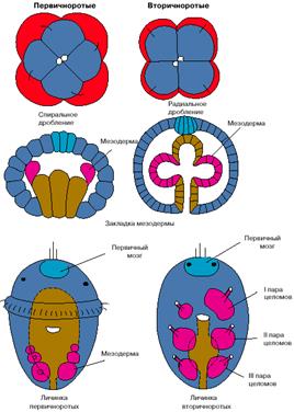 Рис. 1. Особенности эмбрионального развития первичноротых и вторичноротых животных.