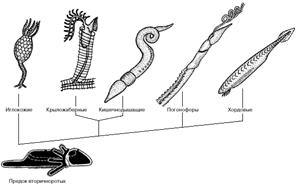 Общий предок вторичноротых животных, по-видимому, вел донный образ жизни, ползая на брюшной стороне с помощью ресничной полоски, подостланной вентральным нервным тяжем (рис. 5). Он имел три пары целомических мешков и щупальцевый аппарат, с помощью которого собирал мелкие пищевые частицы. В дальнейшем могло произойти обособление самого заднего отдела тела, с помощью которого предки вторичноротых временно зарывались в верхние слои грунта. В эволюции вторичноротых этому отделу принадлежит очень важное место.