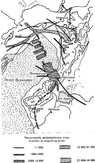 Рис. 2. Осенняя миграция белого аиста в районе залива Искендерун (по: Heckenroth, 1968).