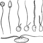 У многих низших грибов бесполое размножение происходит при помощи подвижных зооспор, снабженных жгутиками и способных к самостоятельному движению в воде (рис. 4). Зооспоры развиваются в зооспорангиях. У других низших грибов споры лишены органов движения, образуются они в спорангиях, а сами споры называются спорангиоспорами. Спорангии сидят на особых, отличных от остальных, гифах — спорангионосцах, поднимающихся кверху от субстрата, на котором они развились. Такое расположение спорангиев облегчает распространение спор токами воздуха, после того как они освобождаются от разрыва оболочки спорангиев.
