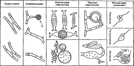 У грибов-зигомицетов половой процесс состоит в слиянии двух, чаще внешне не различимых клеток на концах мицелия (зигогамия). У многих из них сливаться могут лишь клетки, имеющие разные половые знаки, условно обозначаемые 4- или —, хотя внешне и одинаковые. Это явление названо гетероталлизмом (раздельнополостью). Открыто оно было у мукоровых грибов, а в настоящее время известно у грибов из многих систематических групп.