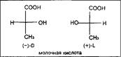 В структурном плане для этих соединений характерно появление молекулярного асимметрического центра, что позволяет присутствовать им в природных источниках в трех формах- -изомера, -изомера и -изомера. К примеру, молочная кислота образуется при молочнокислом брожении лактозы в виде рацемической смеси, тогда как в животном организме в результате гликолиза образуется -О-молочная кислота, которая накапливается в мышцах при интенсивной работе, вызывая характерную мышечную боль.
