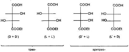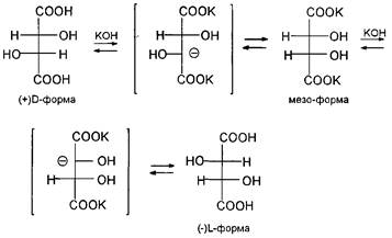 Молекула винной кислоты, образующаяся в процессе брожения виноградного сока, имеет два асимметрических центра, а так как каждый из них может иметь D- и L-конфигурации, то это соединение принципиально может образовать уже четыре конфигурационных изомера:,, и. Так как в молекуле винной кислоты оба асимметрических центра имеют одинаковое окружение и собственно одинаковое вращение, т.е. D=D' и L=L\ то изомеры и идентичны между собой и оптически неактивны. Фактически молекула этой конфигурации имеет плоскость симметрии и молекулярная асимметрия в ней исчезает. Такой изомер, представляющий собой как бы внутримолекулярный рацемат, называют мезоформой. Этерификация одной карбоксильной группы мезоформы винной кислоты приводит к нарушению симметрии молекулы и, соответственно, к возникновению оптической активности у изомеров и.