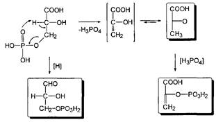 Глицериновая кислота в этих условиях обычно фигурирует в виде 3-фосфата, т.е. она избирательно этерифицируется фосфорсодержащими реагентами в присутствии ферментов по первой спиртовой группе. На следующем этапе 3-фосфат глицериновой кислоты элиминирует фрагмент фосфорной кислоты, образуя а-гидрокси-акриловую кислоту, которая сразу же изомеризуется в пировиноградную кислоту.