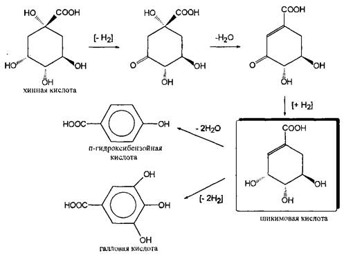 Хинная кислота, являясь исходным соединением биосинтеза ароматических кислородсодержащих соединений, может накапливаться в некоторых растениях в заметных количествах. Но основное предназначение этой кислоты — образование шикимо-вой кислоты, ключевого интермедиа-та вышеуказанных синтезов, с последующим переходом к бензольным производным, используя реакции дегидратации и дегидрогенизации.