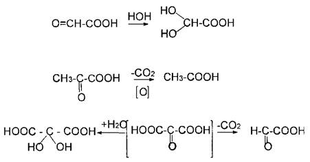 В случае б-оксокислот можно отметить легкость присоединения нуклео-фильных реагентов по карбонильной группе и легкость реакций декарбоксилирова-ния — пировиноградная кислота в условиях окислительного ферментатив-но катализируемого декарбоксилиро-вания образует уксусную кислоту. Мезоксалевая кислота сочетает в себе легкость протекания обоих этих процессов — она существует только в виде гидратированного аддукта и в водном растворе легко разлагается на глиоксалевую кислоту и двуокись углерода.